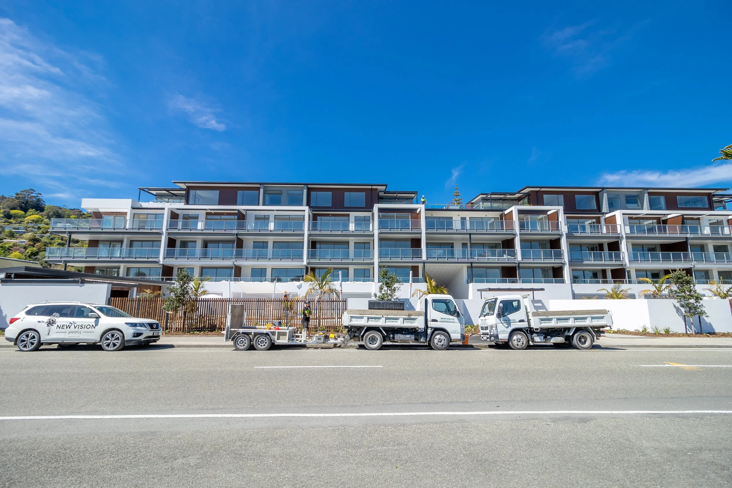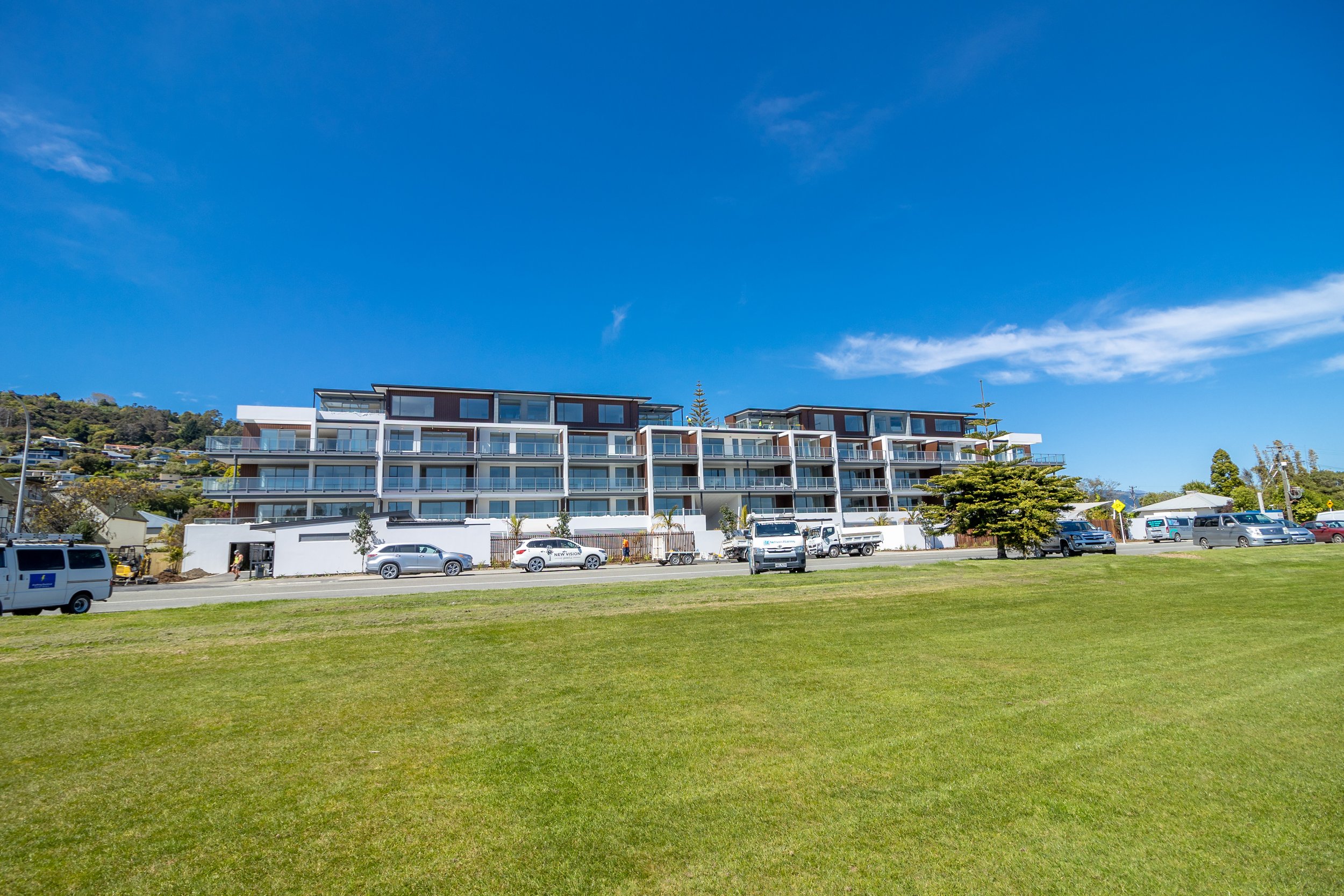 Ocean View Apartments is a 5 story, 37 unit development on the beach front of Tahunanui in Nelson. The development is unit titled, and features a range of 1-3 bedroom apartments, four three bedroom penthouse units at the top floor, plus resort style landscaping facilities including three pools, a spa and a gym.